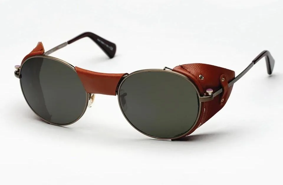 - Особливого стилю їм додають шкіряні бічні щитки. Окуляри, до слова – ручної роботи.