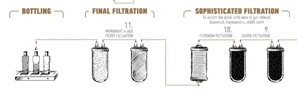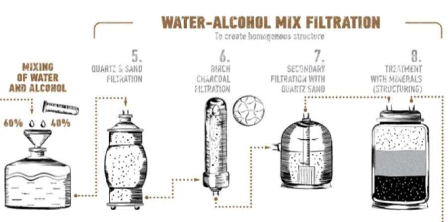 Процес починається з кварцової фільтрації води або фільтрації в тонкому шарі. Результат залежатиме від органіки піщинок. Задача кварцового піску – видалити невидимі частинки, які потрапили у воду з підземних глибин. Мембранна фільтрація забезпечує глибше очищення води: видаляє природні речовини, не сумісні зі спиртом, або ті, що надають сторонні відтінки аромату та смаку.