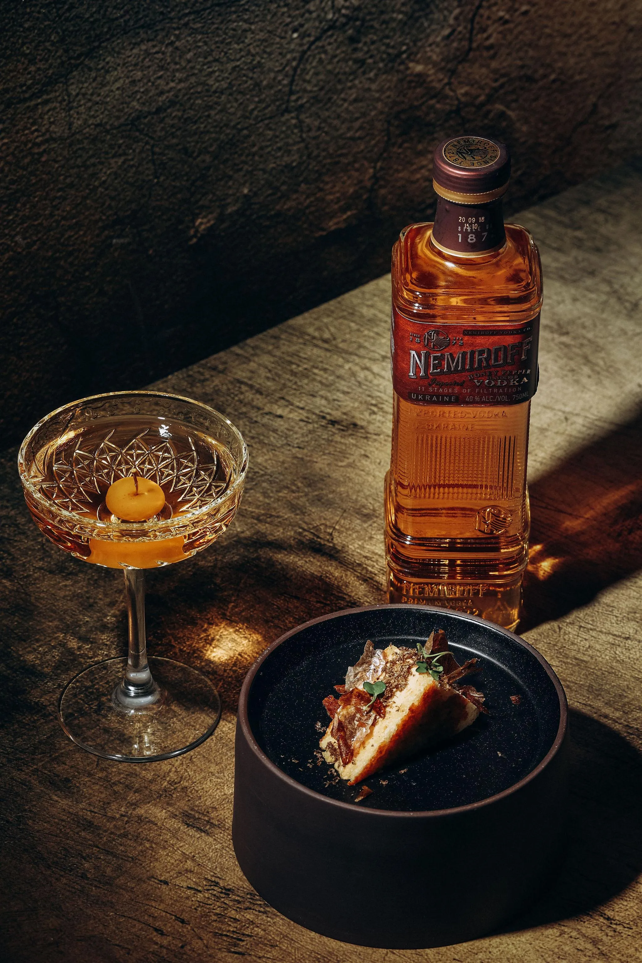 - Добавь Nemiroff De Luxe Honey Pepper и другие ингредиенты в стакан для смешивания, наполненный льдом;