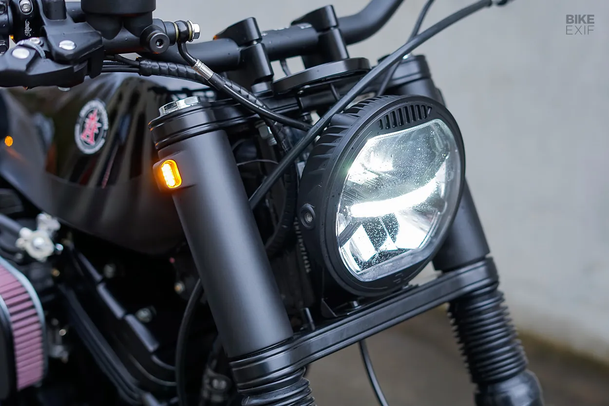 На байк нанесено порошковое покрытие почти везде, от кожуха двигателя к раме и даже вилкам. Crooked также использовал 3D-принтер для затемненных крышек вилок, которые включают незаметные сигналы поворота.