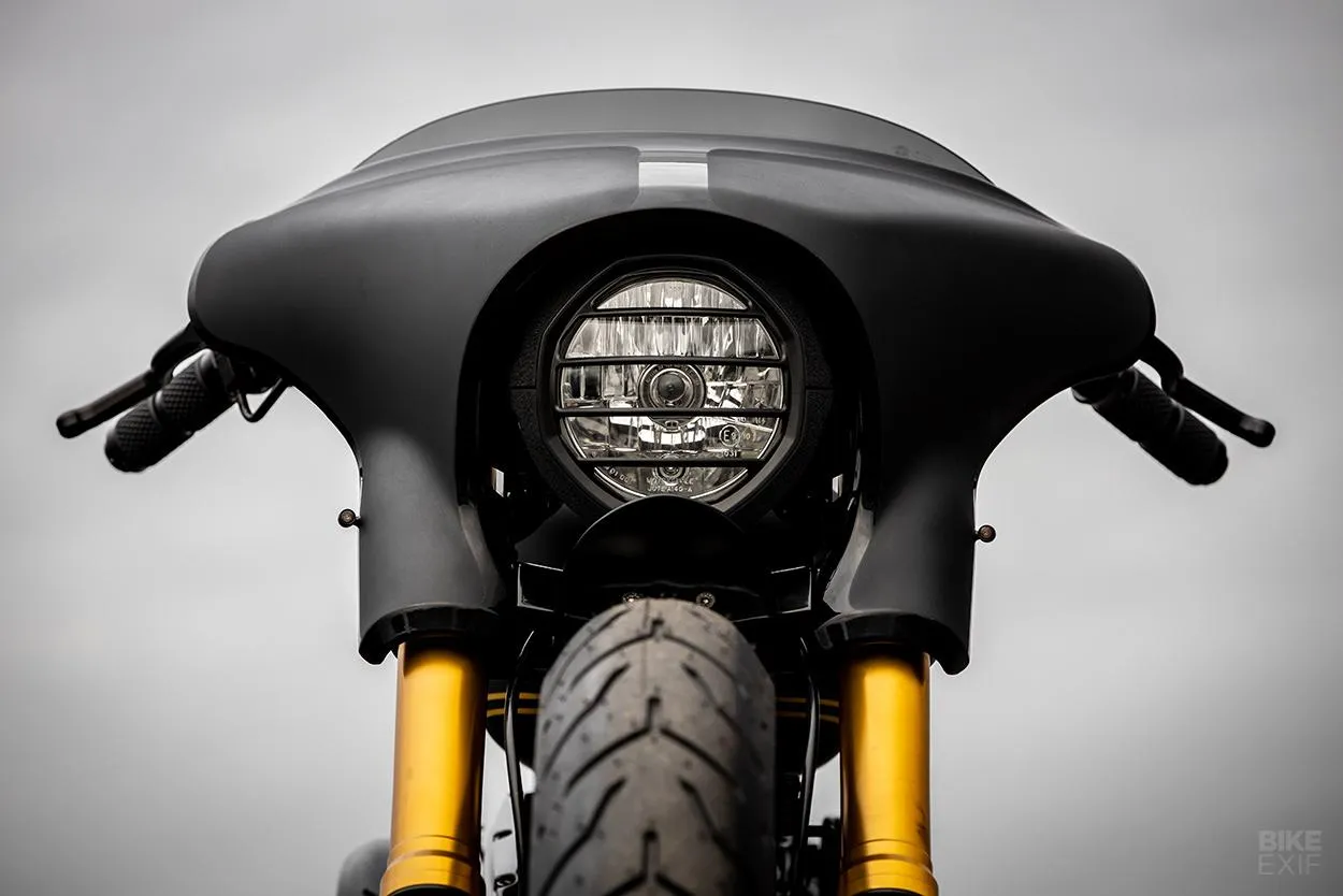 Мартин сам сделал идеально интегрированное индивидуальное сиденье, но украл топливный бак в 125-кубового немецкого мопеда 1960 года. Обтекатель узнаваемый – от Harley Sport Glide 2018 года.