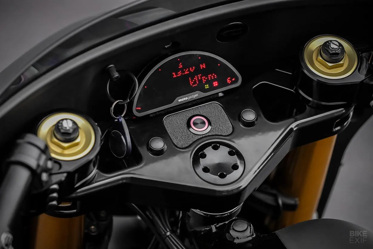 Кнопка запуска двигателя и кнопки регулировки громкости выхлопа аккуратно встроенные: здесь нет обычного зажигания, так как мотоцикл управляется бесконтактным цифровым замком зажигания Motogadget.