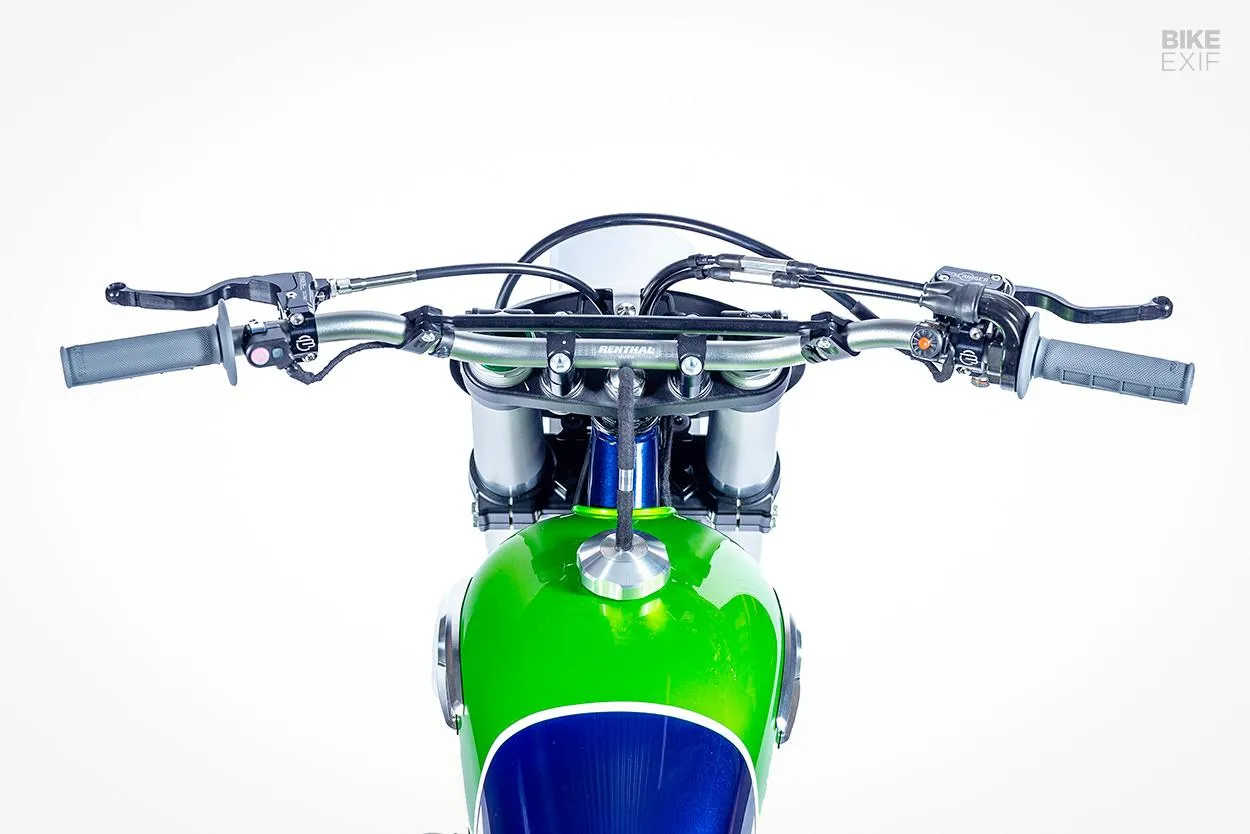 Ты также можешь увидеть элементы управления Beringer вверху, установленные вместе с рулем и ручками Renthal. А поскольку на этом Kawasaki не предусмотрено катание по городу, проводку упростили до кнопки запуска и выключателя.
