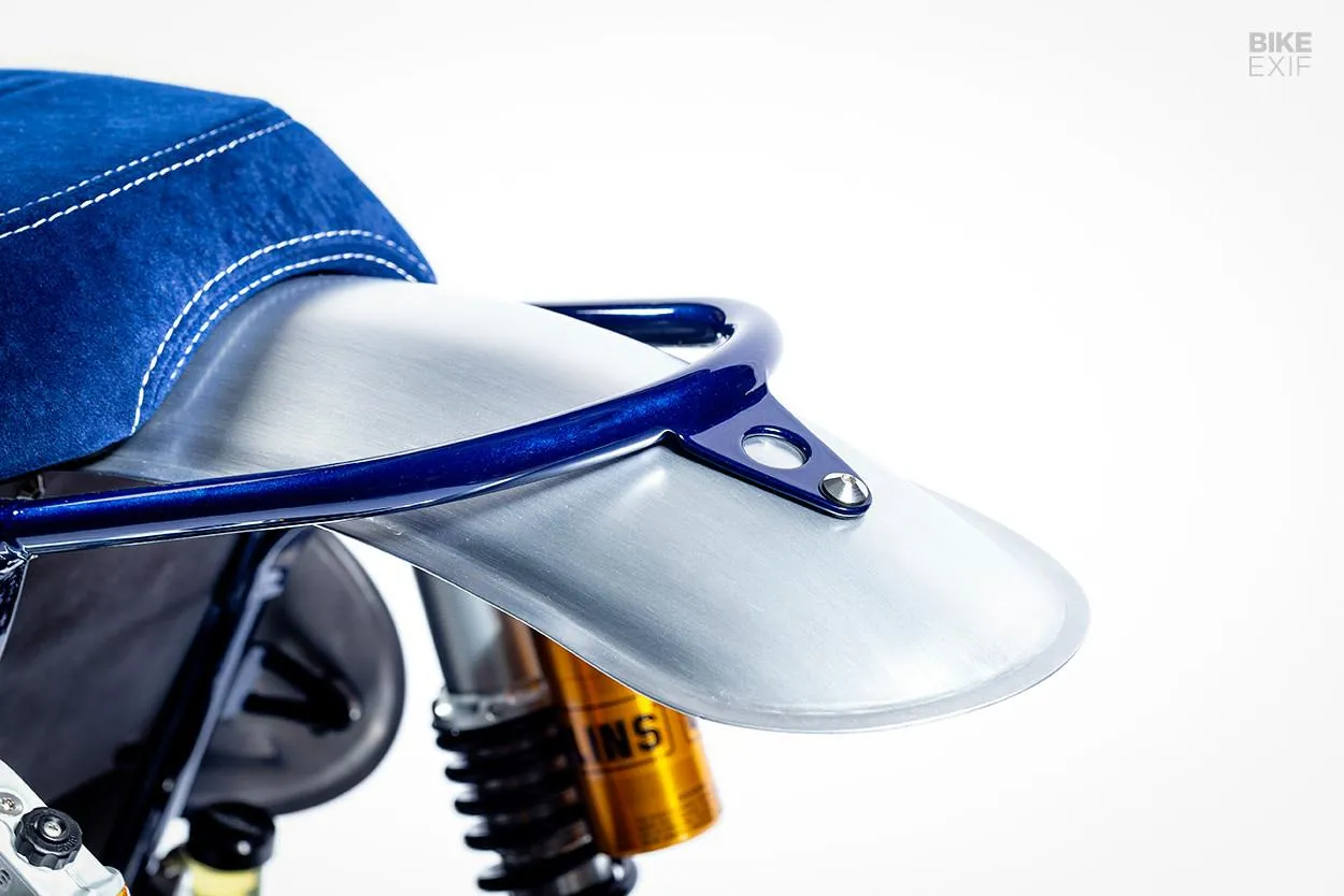 Соарес немного поработал над рамой, но сохранил ее длинную изогнутую заднюю петлю, просто добавив новое выступление для заднего крыла. Наверху – новое короткое сиденье, а по бокам – пара алюминиевых табличек с номерами ручной работы. Винтажные крылья в стиле триала тоже изготовлены на заказ.