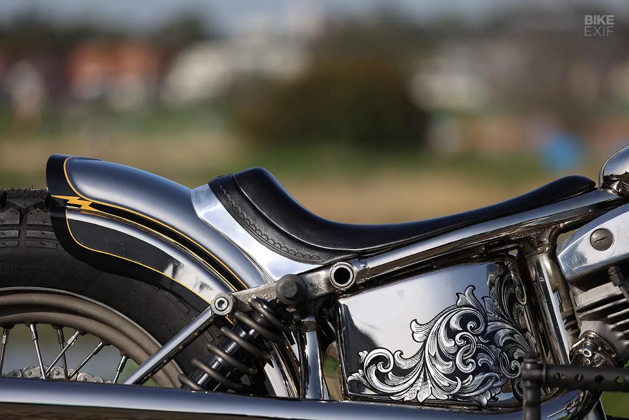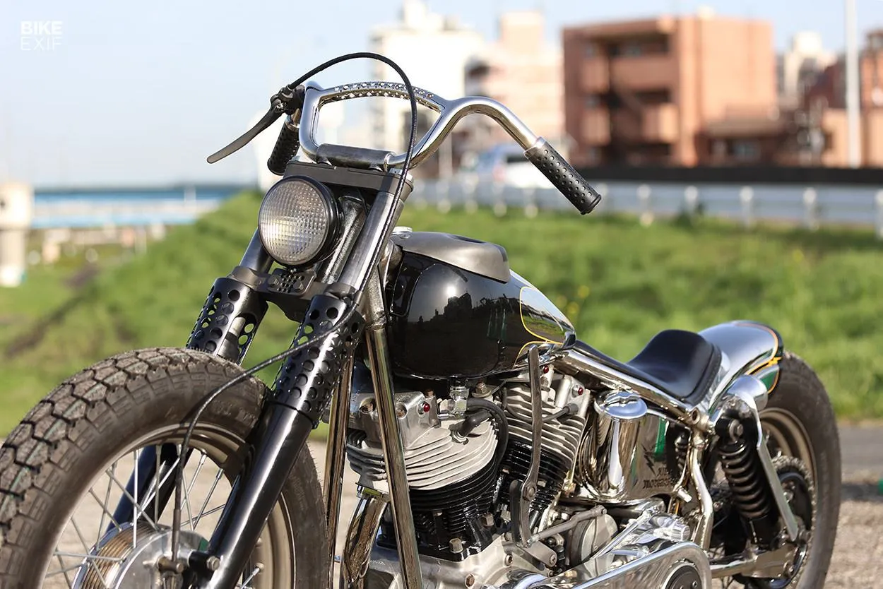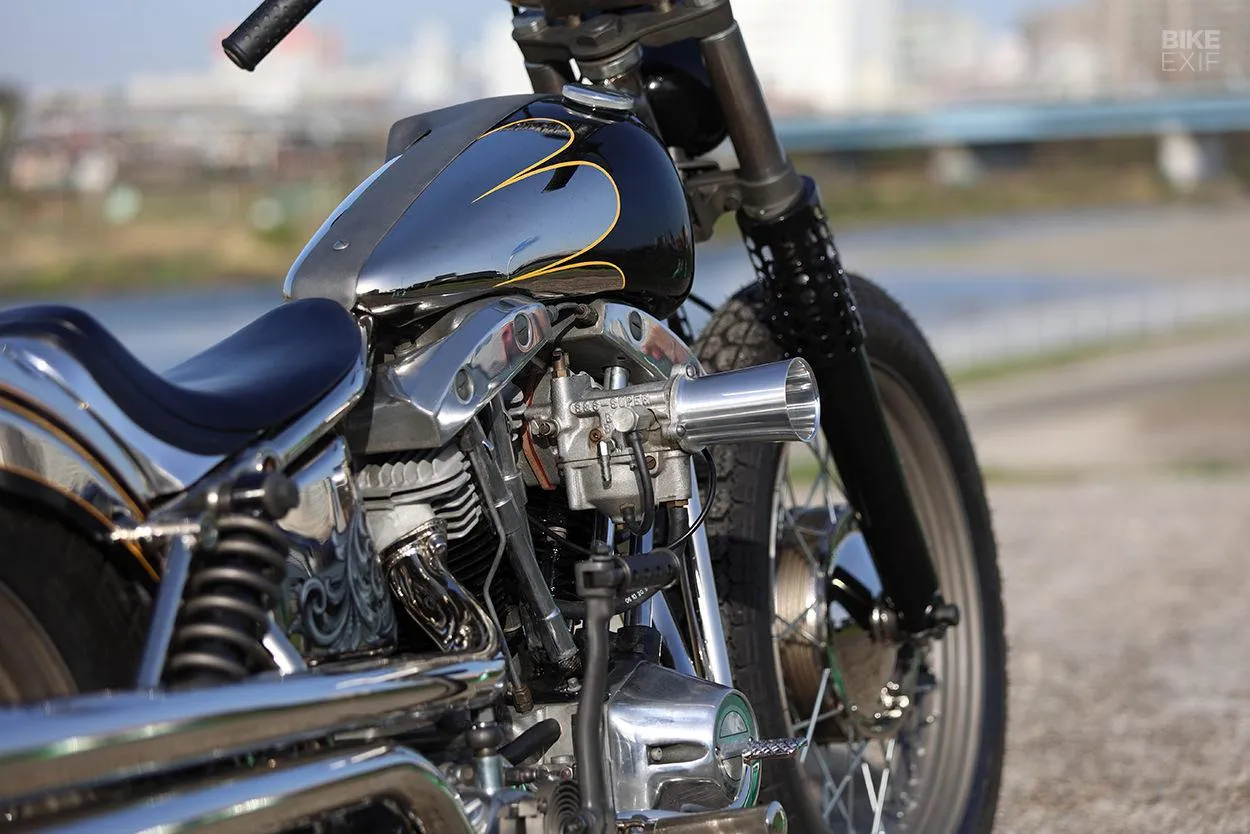 Хидея отредактировал кадр, хотя он скромничает, какие именно части были изменены. Затем он сузил тройки и привил 41-миллиметровую переднюю часть Shovelhead. Вилки изменили, и теперь они имеют пару просверленных крышек. Пара 13,5-дюймовых амортизаторов Progressive поддерживает заднюю часть.