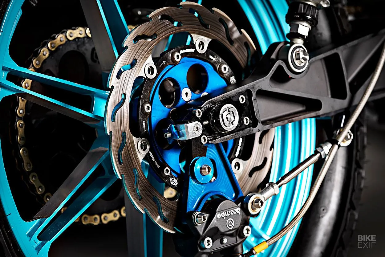 Спереди нет тормозов, но сзади есть суппорт Brembo и главный цилиндр, соединенные плетеной линией из нержавеющей стали. Поскольку Максим модернизировал байк с заднего барабанного тормоза, все его компоновки было индивидуальными – до кронштейна суппорта и ножного управления.