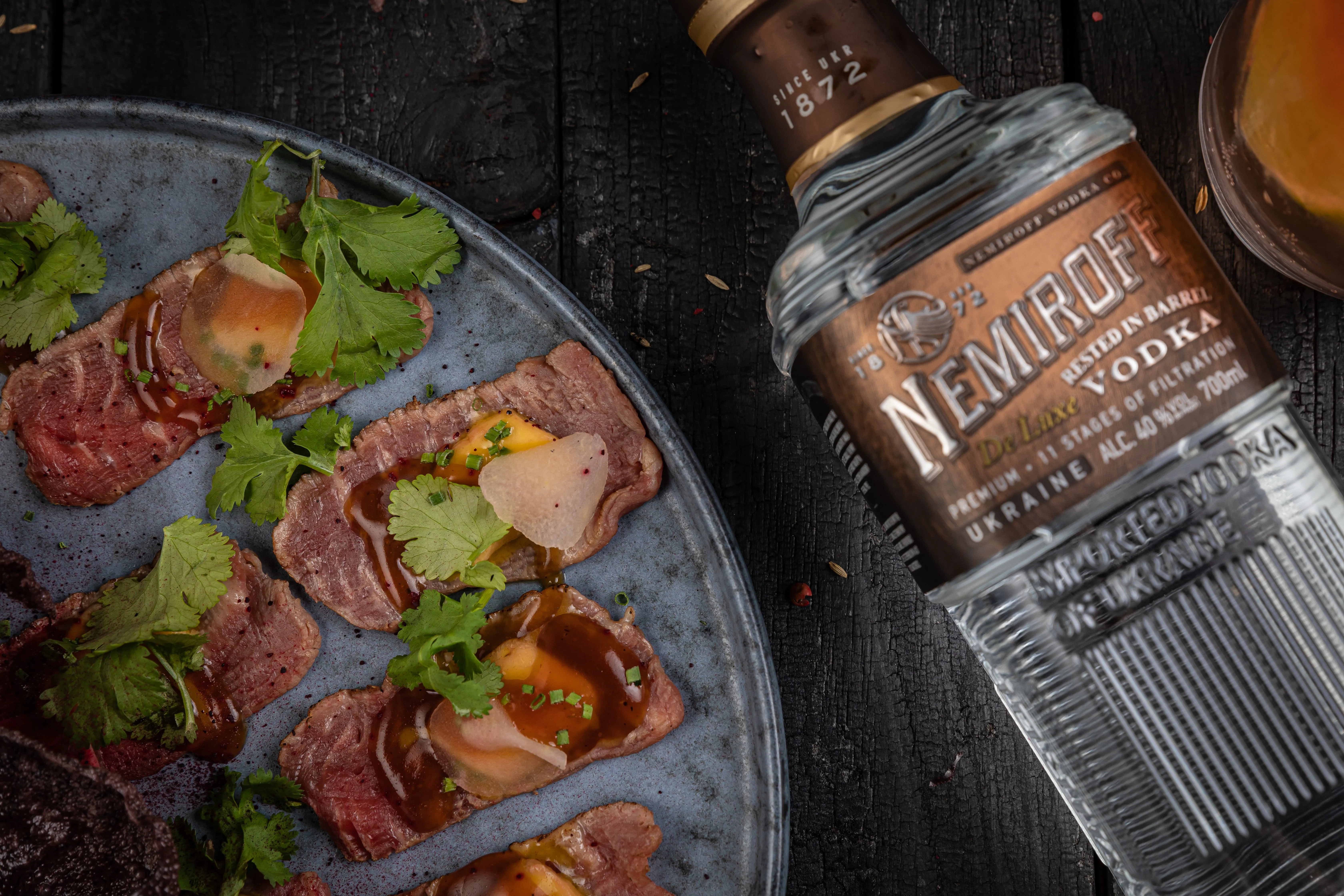Татакі з яловичини ідеально поєднується з коктейлем на основі горілки Nemiroff Rested In Barrel / Фото Nemiroff