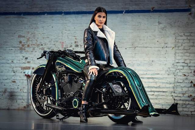 Обгорнутий у зелений колір з золотими та срібними вставками, мотоцикл отримав щедро оздоблені крила спереду та ззаду, взяті з серії El Dorado та накладені поверх 23-дюймового переднього та 18-дюймового заднього коліс (в оригіналі колеса – 16 дюймів). Такий підхід дозволяє максимально підняти перед байка, а також зробити плавний спуск до заду.